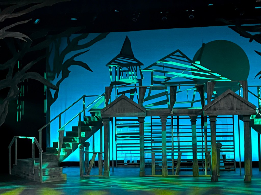 Brian Ball’s set design showcased a multi-level skeletal structure symbolizing the Addams family mansion, with a large full moon and gnarled, leafless trees silhouetted in the background.